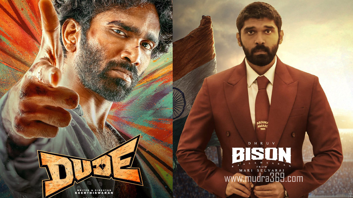 ‘డ్యూడ్’ సినిమాలో ప్రదీప్ రంగనాథన్ హీరో కాగా, ‘బైసన్’ సినిమాలో ధృవ్ విక్రమ్ హీరోగా నటించాడు. ‘డ్యూడ్’ హీరోయిన్ మమిత బైజు. ‘బైసన్’ హీరోయిన్ అనపమ పరమేశ్వరన్.